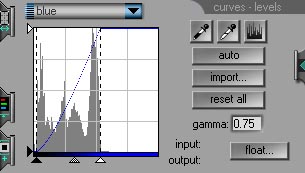 Because NikonScan's gamma curves are somewhat tiny, manipulating them can be clumsy and finicky. (Version 2.5 of NikonScan enables a twice-as-large gamma curve display by floating the curves-level display and then enlarging the window. Amazingly, the programmer chose to display the box as a modal dialog box--you can't do anything outside of curve adjustment unless you first close the display. Nothing comes easy.) Another method of modifying the blue curve is to set the mid-tone gamma by moving the mid-tone (gray) marker or by entering the equivalent value in the edit box. In this case 0.75 was the appropriate value.